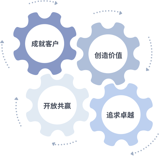 成就客户是一切决策的出发点,创造价值是衡量所有工作的标准,追求卓越是SG胜游做事做人的态度,开放共赢是SG胜游的格局也是最终的结果。价值观的齿轮环环相扣,推动着组织里的每个人不断向前。
